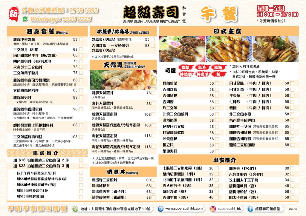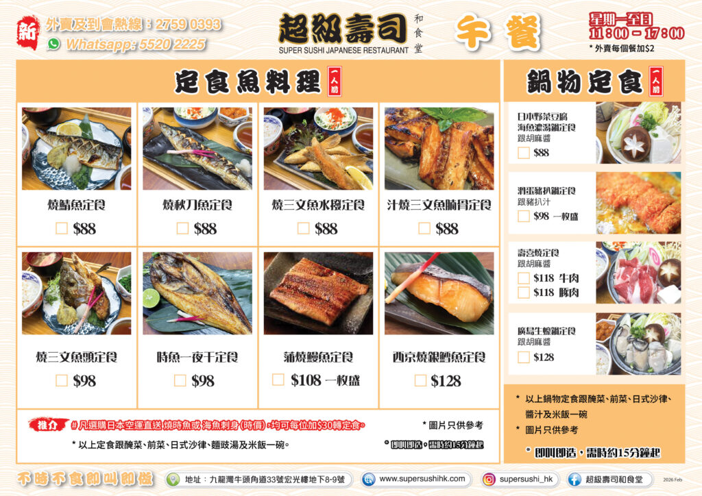 本網站並不支援午餐及下午茶菜單。客人如要下單,可以WhatsApp 55202225 或 致電27590393下單。